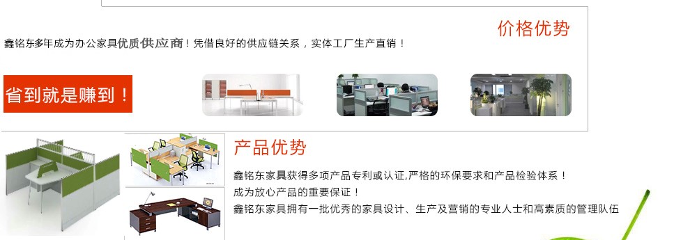 深圳市鑫銘東家具有限公司專業(yè)銷售各類辦公家具!產(chǎn)品涉及多種系列,如:班臺、班椅、屏風(fēng)、會議桌、會議椅、辦公沙發(fā)、茶幾、辦公桌、文件柜、電腦桌椅、各式餐臺、餐椅、書柜等辦公家具。 鑫銘東家具擁有一批優(yōu)秀的家具設(shè)計、生產(chǎn)及營銷的專業(yè)人士和高素質(zhì)的管理隊伍。銘東家具以"先難后易"之戰(zhàn)略,在產(chǎn)品結(jié)構(gòu)、產(chǎn)品質(zhì)量及服務(wù)水平方面,均推陳出新,力求完善,精益求精。使我們的產(chǎn)品質(zhì)量保持在國內(nèi)外家具潮流的先進水平,力求滿足客戶的特殊需求。鑫銘東家具多年來致力于環(huán)保、實用家具的設(shè)計與開發(fā),集生產(chǎn)、銷售、服務(wù)于一體。本著"以人為本"的設(shè)計理念,大量開發(fā)符合人體工程學(xué)的各種產(chǎn)品,以"誠信為本"的質(zhì)量方針,真材實料,認(rèn)認(rèn)真真做產(chǎn)品,實實在在做人。鑫銘東家具更致力于創(chuàng)造"零維修率"的制造境界,實現(xiàn)"沒有維修的服務(wù)才是最好服務(wù)"的口號》了解更多